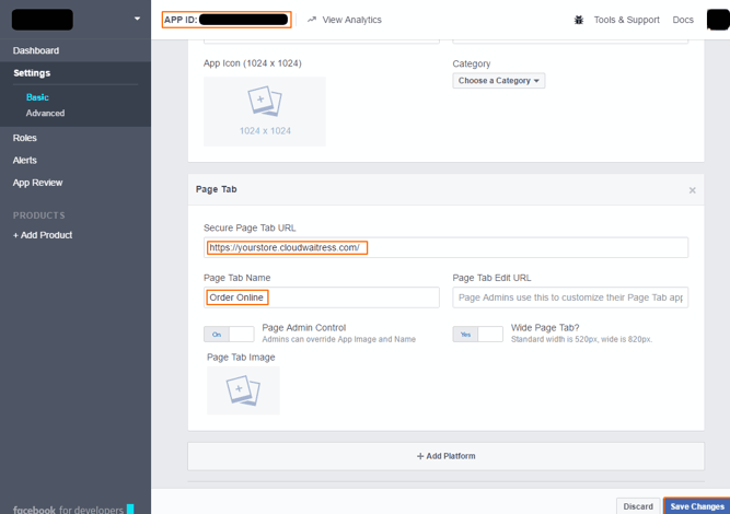 To add the page tab to your Facebook page, you will need your Facebook App ID which you will see highlighted in orange in the previous photo at the top of the page